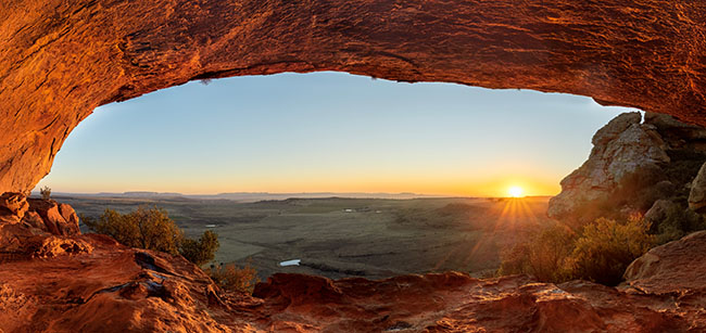 At Holkrans, the sandstone cave frames a vast Free State sunset.