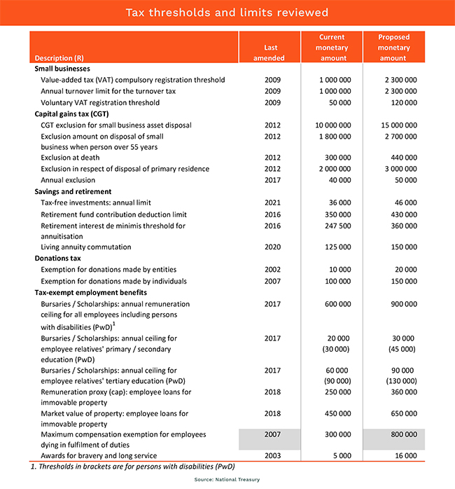 More than 20 thresholds are being increased. Some of these, like the bravery award, have not been touched since 2003. A more notable update is the VAT registration threshold to R2.3m from R1m, where it had been stuck since 2009. Likewise the annual turnover limit to qualify for the much less onerous turnover tax, has been upped from R1m to R2.3m, also for the first time since 2009.
