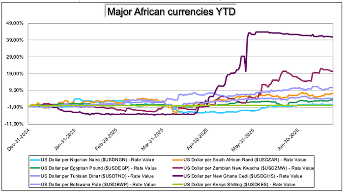 The extent of the rise against the dollar this year is mixed, with the bigger economies particularly moving in a tight band. The Nigerian naira is up marginally against the dollar, the rand is up 7.3% and the Egyptian pound up 3.6%.