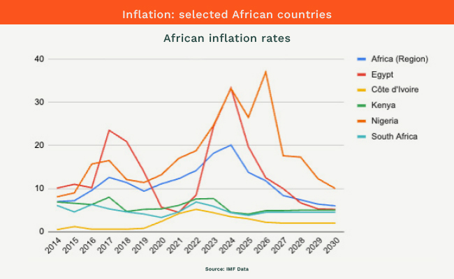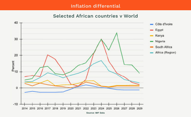 However, talking about continental averages can be very misleading, according to Paul Robinson, portfolio manager and head of Africa research at Laurium Capital. In most cases, you have to go country by country. The African average is often distorted by some countries which have very high inflation, and recently the most egregious culprits have been Ghana, Zambia and Nigeria and Egypt.