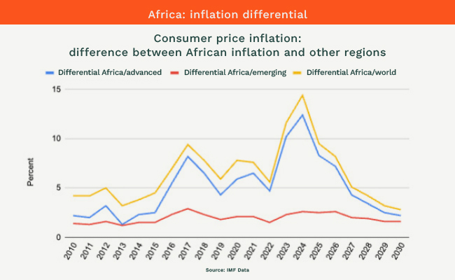 From a longer perspective, the difference between inflation rates in the developed world and those in Africa blew out during the Covid period, but the “convergence trend” is now coming back fast, and the International Monetary Fund (IMF), somewhat hopefully, sees the differential declining to historic lows by the end of the decade.