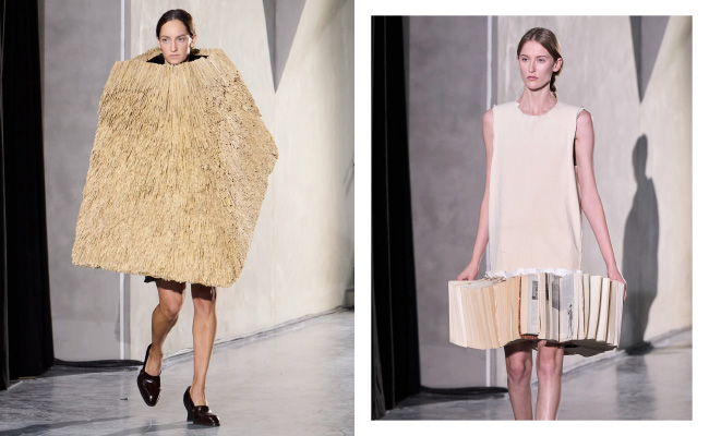 Hodakova crafted a shift mini edged with actual books, and another piece, a Currency favourite, a piece of perfect rhomboid thatch, shedding gently as the model walked. But the pièce de résistance? Thom Browne’s alien-headed models: glistening green, big-eyed, dressed in suits made from many suits. Poor, precarious extraterrestrials teetered down the runway in terrifyingly high platform heels.