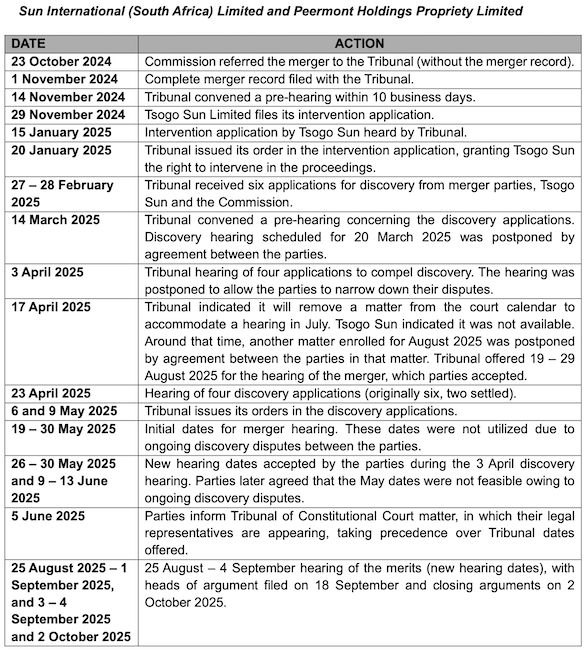 Suggesting, however subtly, that the tribunal was to blame, is disingenuous. Closer to the truth would be that the merging parties and the intervening party (Tsogo Sun) were responsible for scheduling delays that ultimately resulted in the deal’s closure heading beyond the October 2 long-stop date.