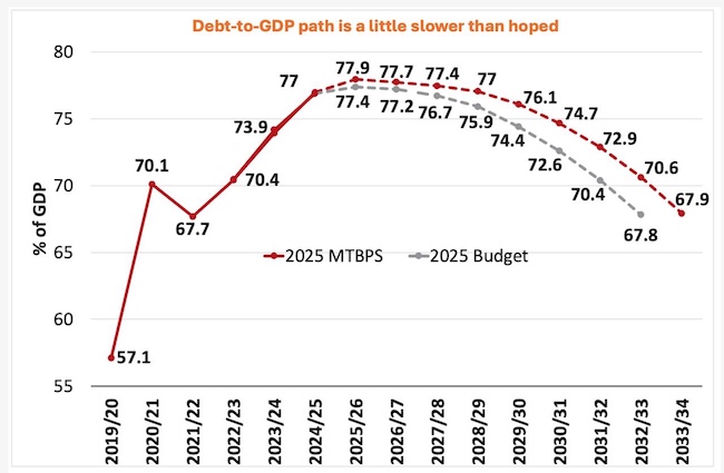 Gross debt is projected to stabilise at about 77.9% of GDP this year, the first time since 2008 that the ratio does not rise. But the glide-path downward is more gradual than earlier forecasts, largely due to revised nominal GDP and a weaker growth outlook.