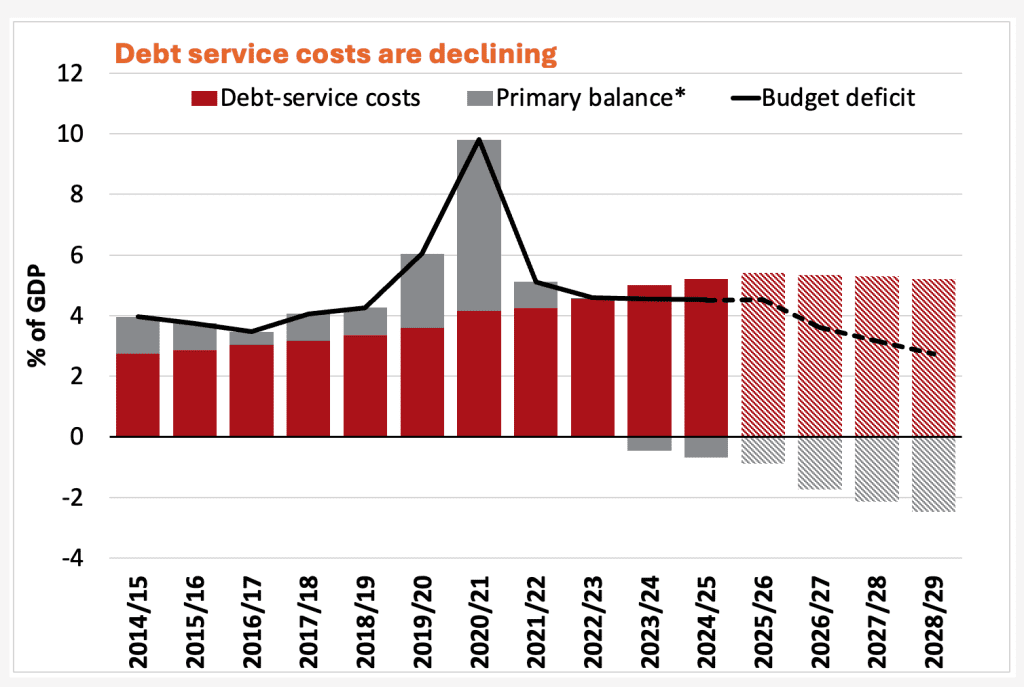 The main-budget deficit is projected to decline from about 4.5% of GDP in 2025/26 to roughly 2.7% by 2028/29. The improvement relies on the primary surplus expanding, moderate growth and discounting the impact of future tax increases.