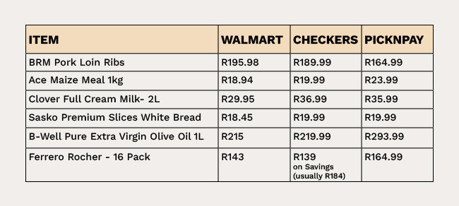 The answer is mixed. Some items cost the same, others are cheaper. Coffee pods and certain cuts of meat were similarly priced, while many staples came in slightly lower. Below is our rough Currency Food Basket comparison with Checkers and Pick n Pay. It includes a couple of luxury items – and on price, Walmart South Africa does come out ahead.
