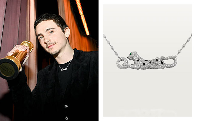 At the latter event, little Timmy’s saving grace was his Panthère de Cartier necklace. Crafted in 18k white gold with diamonds and emeralds, the piece landed perfectly because the rest of his look was so restrained.