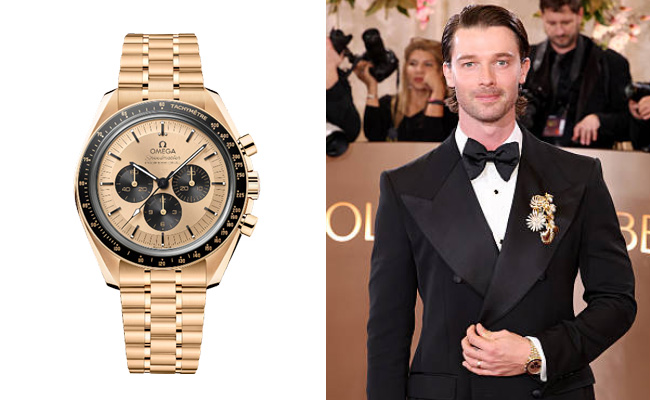 Patrick Schwarzenegger wore an OMEGA Speedmaster Moonwatch Professional in Moonshine Gold, paired with a quirky collection of, yes, more brooches. The watch retails at close to half a million rand and features on many a collector’s wish list.