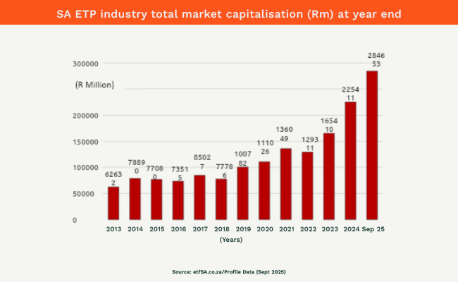 New data released this week by ETFSA shows that by October, investors had shunted R284.6bn into the asset class – effectively doubling the size of the local market in three years, from R129.3bn in 2022.