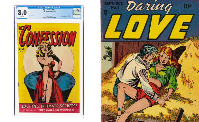 These print bonanzas of swooning, buxom women include crackers like the first in the 1953 Daring Love series, which features the debut published work from legendary Steve Ditko, who was the co-creator of Spiderman and Doctor Strange. It’s already nabbed bids of over $1,300. By comparison the top-quality copy of the very scarce My Confession #7 has hit the $4,100 mark in early bidding.