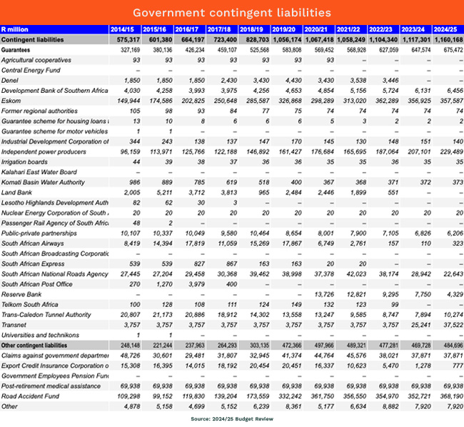 Even though it is large, the contingent liability of independent power producers probably falls into this category, because it will only be triggered if Eskom fails to buy the power produced, which is very unlikely, as Eskom’s debt itself has been covered by government, and Eskom needs the power generation.