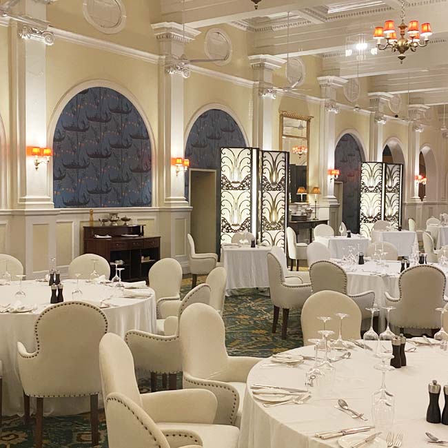 The previous afternoon, I’d taken a quick peek through the thick glass windowpanes into the dining hall. The week before my visit, the new cream dining chairs were delivered. Now the room, with its high ceilings, Art Deco screens and chinoiserie wallpaper insets, looks poised to host a stately dinner.