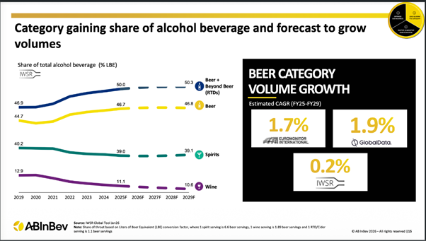 Second, and for the first time, no/low alcohol is disproportionately helping beer, because it still feels like beer, and the segment is growing fast and becoming a meaningful pillar of the category.